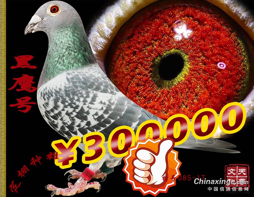 本鸽是一羽藏品级的超级皇牌种雄,他气质高贵,自身为威力公棚的第一关没指定22名、第二关指定1680名、第三关没指定600名、同窝天平公棚300公里21名,同窝北京公棚预赛5名、决赛指定鸽315名..........该鸽上手羽质紧薄,膀羽肌肉宽厚有力,飞羽出众,脉动优秀,身形骨架坚硬手感彪悍极具爆发力,眼睛结构高级、智慧线与速度线明显,是一羽完全符合职业赛鸽要求的超级鸽,他的平辈支持出去四川获得冠军、新疆获得冠军、该鸽系的上代获得新疆哈什公棚的亚军指定鸽冠军等众多好成绩,也是我经多年实战应用积累的真英雄,真正把他从中国一直赢到南非太阳城,把中国的鸽的赛鸽大旗一直插到南非太阳城的英雄鸽系!该鸽是一羽能胜任复杂多变恶劣气候的超级鸽,条件越艰苦越会有超长的发挥。血统高贵,父亲为为中华巴龙与比利时利蒙日617公里全国总冠军所作出的超级种雄雨点黄眼610-14(中华巴龙的孙代鸽获得山西地方特比环4关鸽王冠军、指定鸽冠军)他的母亲为伟大传奇电脑金母202的孙女灰黄眼自身本身也是公棚的高位获奖鸽..............该鸽系也是打特比环与庄园团队赛的超级种雄。我希望他能为你纵横蓝天,勇夺冠军!!! 他也是经我多年实战应用所积累的真英雄,该鸽系的上代获得100公里冠军、200公里军、300公里冠军、500公里冠军、1000公里省赛当日归的亚军...........支持出去为众多鸽友赢得了众多荣耀赛绩,他也是我把他从中国一直赢到南非太阳城的英雄鸽系,他在规矩的赛事中具有100%的超级发挥,我把黑鹰号的成功范例给大家分享,向所有鸽人前辈表示致敬..................... 我赞美他 中国人自己的骄傲………………!!!(撸起袖子加油干)