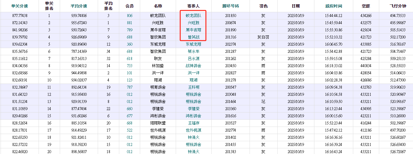 殿军由智欣集团鸽友曾英战获得,环号201316的灰白条赛鸽,于15:52:10.32完成打钟,以空距421公里,分速839.7979米/分的成绩获得殿军,同时以926.69069米/分的平均分速位列综合第九。上个月,曾英战鸽友还问鼎了三合诚俱乐部秋赛的综合鸽王,今年曾鸽友可谓佳绩连连。