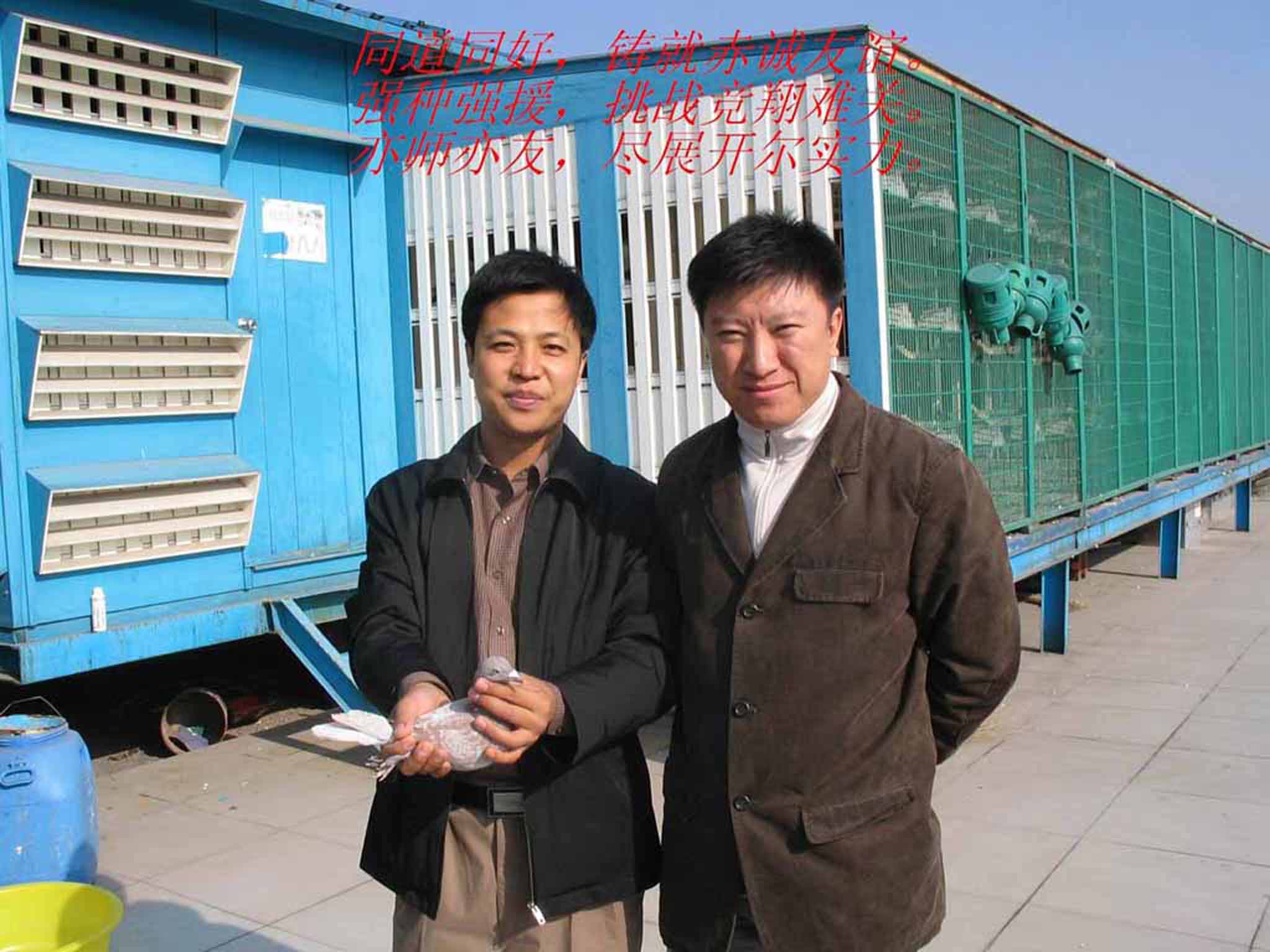 兄弟俩自幼爱鸽饲鸽,后因学业中断。工作后兄常驻北京,因机缘巧合与唐山开尔集团邢伟董事长成为莫逆之交。随着开尔集团鸽业公司的创建和大手笔引进国际顶尖名鸽,邢大哥说:“好东西要和好朋友分享,好鸽子须和好朋友分养”。在开尔倾情支援下,兄弟俩再续儿时梦想。又有好邻居、好朋友刘文兄的加盟,三人的团队愿将爱好和友谊进行到底。更得邢大哥垂青,本鸽舍赐名为“开尔友谊鸽舍”。 可谓是:同道同好,铸就赤诚友……