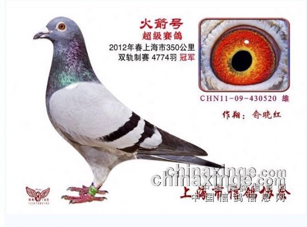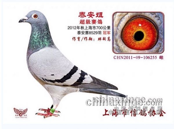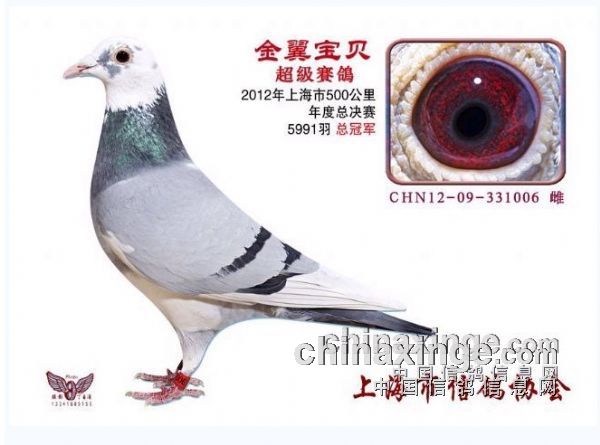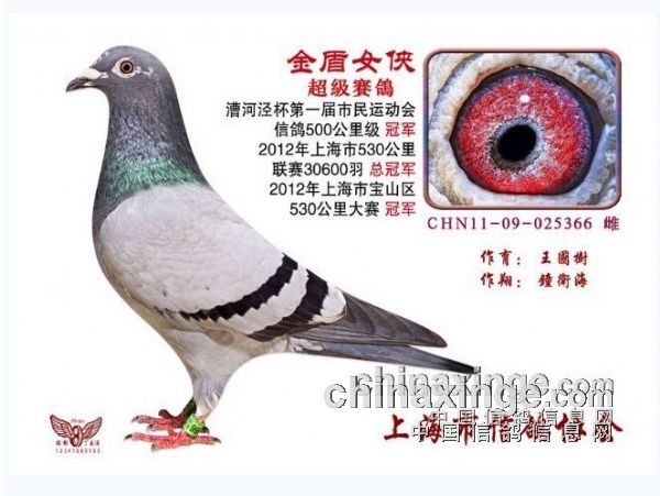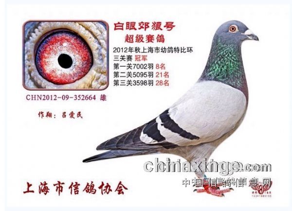 此鸽于5月27日曾夺得上海市1000公里5119羽综合亚军,加上去年先后获得上海市国家赛825公里11850羽20名,上海市1000公里9365羽5名,最终以2.88的得分,获得2011-2012年度中国奥林匹克鸽王赛马拉松组总冠军。>>详细