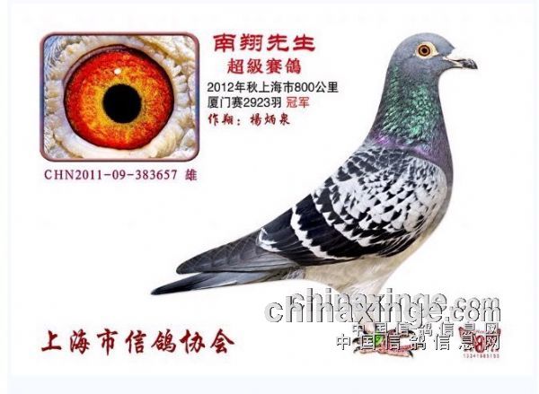 2012年上海市800公里厦门赛11月18日早上7点06分开笼,共计2923羽赛鸽参加比赛。杨炳泉的2011-09-383657赛鸽次日早上7点59分归巢报到,以1070.96米/分的速度夺冠。>>详细