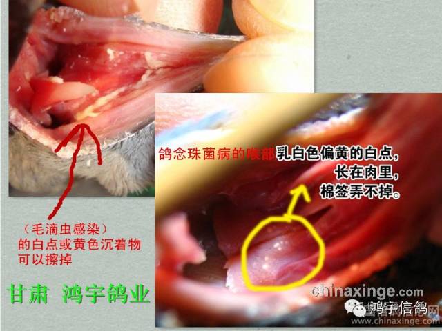 内脏型:鸽食入被污染的饲料和水而被感染。常表现精神沉郁,羽毛松乱,食欲减少,饮水增加,有黄色粘性水样的下痢(似硫黄色,带泡沫),龙骨似刀,体重下降。随着病情的发展,毛滴虫还侵袭鸽的内部组织器官。剖检病变,在上消化道时,嗦囊和食道有白色小结节,内有干酪样物,嗦囊有积液。肝脏、脾脏的表面也可见灰白色界线分明的小结节。在肝实质内有灰白色或深黄色的圆形病灶。但白喉(粘膜)型的鸽痘、鸽念珠菌病的喉部病变与本病相似。鸽沙门氏菌病和鸽结核病的肝、脾小结节也与本病相似,应区别清楚。