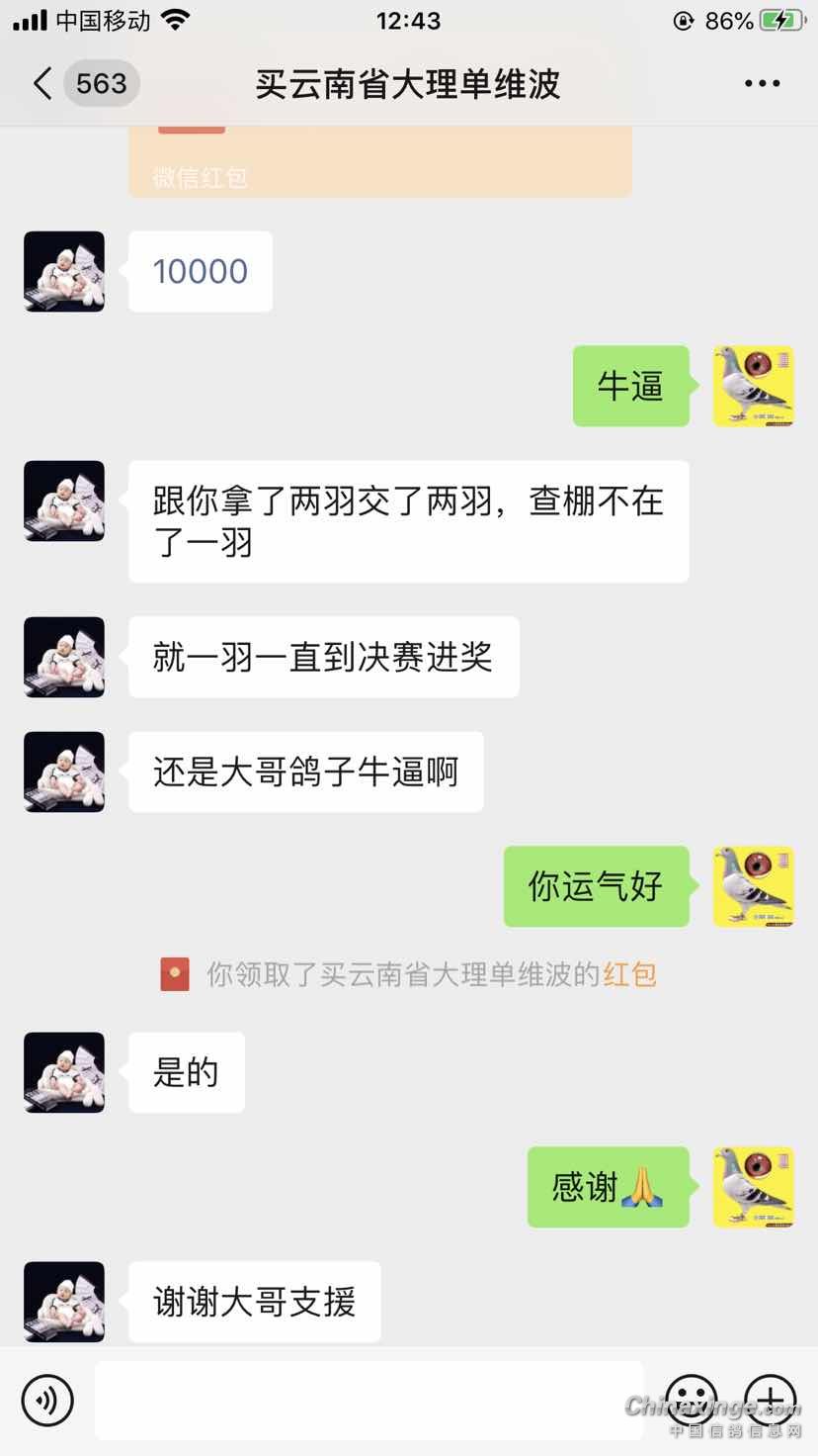 恭喜云南老铁,使用本舍幼鸽,云南旗星公棚仅送两羽,决赛获得379名,赢得奖金1W!