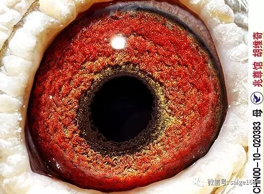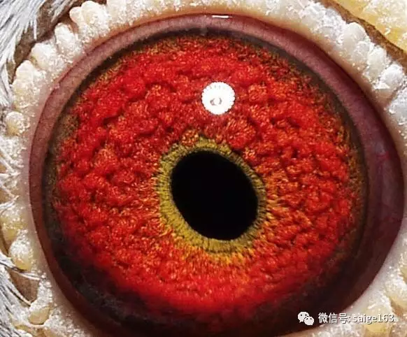 (五)对于优秀的种鸽来说,高级的内线口总是伴随在其眼睛中,如若波浪型、皱纹型、大瓶盖型、及锯齿状型、细绳型等等。选配时尽量掌握采用不同类型交配,不能采用同类型相配,眼志的选择也是一样,例如立眼志配卧眼志,满砂型配同心圆等。这样出的后代眼砂才能丰富多彩得到强化。