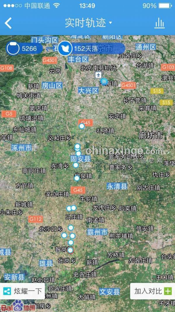 在某鸽友的训放中,笔者收集了如下数据。从图一来看,信鸽的轨迹直观显现。每个轨迹点都含有某时刻的飞行信息。如图二表明,此信鸽当时刻飞行速度为213.00米/分钟,所在位置为河北省保定市高碑某处。当前已飞行距离207.29公里。这些情况客观直观的显示在鸽友的手机中。