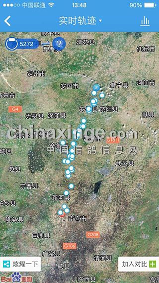信鸽A绝对是个值得培养的好种,我在手机上看到的显示,它实际飞行速度为1161米/分,而且飞行路线相对是条直线,由于飞行距离比空距多出12.9公里,因此分速计算为:937.5米/分不绕远。第一次直观的看到鸽子的飞行路线,我心里由衷的激动。不贪玩,才是我的好鸽子!