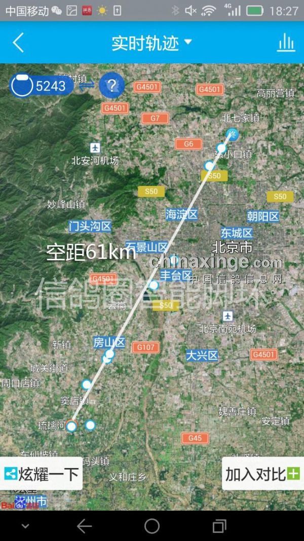 9月14日早晨6点30分,李先生共放飞信鸽200羽,其中5羽鸽子佩戴了轨迹跟踪脚环。7点19分,第一羽佩戴跟踪脚环的信鸽归巢,实际飞行距离64.5公里,比空距只多飞了3.5公里,基本为直线飞行,下图是这羽信鸽的飞行轨迹图: