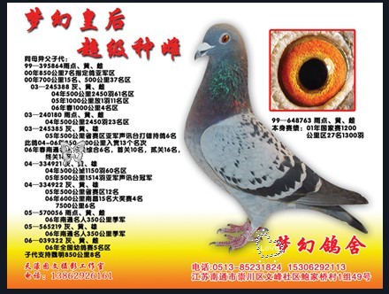 本舍以詹森,林波尔,凡龙,凡皇路易,慕利门,克拉克为主血。另有引进的杨.贡多拉斯,电脑.戈马力,盖比.凡得那比,等一批原环种鸽及胡本,桑杰士,苍白骑士等品系。至今已获各级比赛冠军,亚军,季军多次及前十位近百次,支援鸽友也年年夺冠! 本人愿交天下鸽友!……