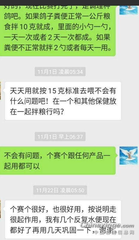 赛鸽调不好输一年, 种鸽调不好输三年。 如果不确信走完调理流程后种鸽是否到位;如果不确信粮食里的霉菌毒素是否还存在;如果不确信种鸽能不能把添加的营养都吸收,请用个赛个拌粮,一公斤粮食拌5--10克,每天一用或隔天一用。