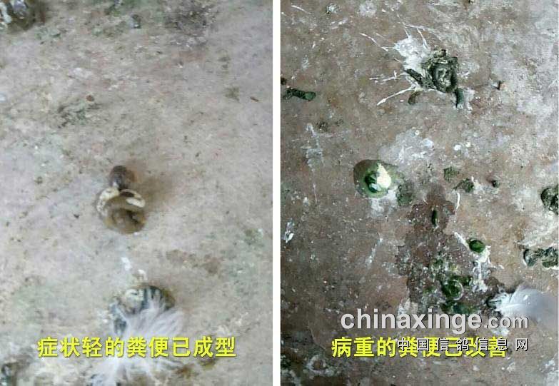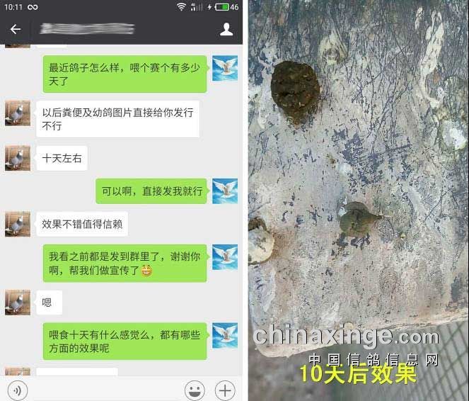 按一公斤粮食拌20克个赛个喂了3天,4月15日他发来使用前后粪便对比照片,种鸽跟幼鸽的粪便开始成形,体现出改善效果。
