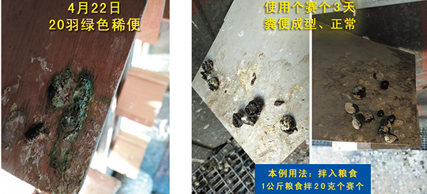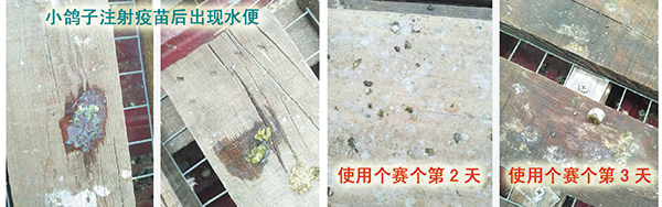 一、某公棚全程应用个赛个,连续55天,粪便始终保持小球状,并且一直保持为小球状。每批注射疫苗的鸽子,腹泻现象都极少。期间从未使用预防性抗生素加肝精。