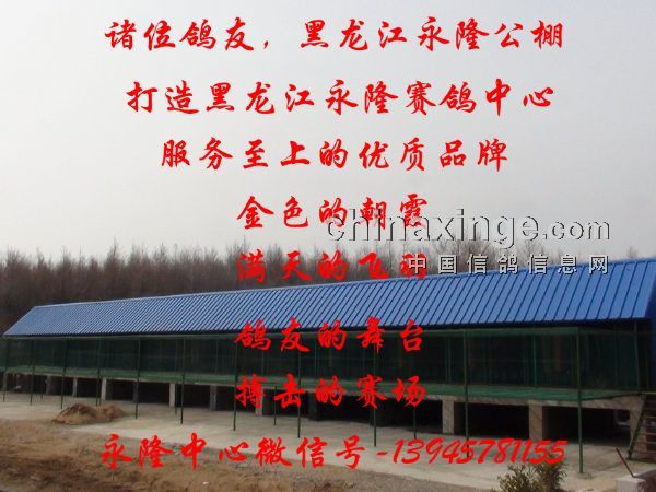 永隆地产赛鸽中心,是由黑龙江永隆地产,投资兴建的集,信鸽,养殖,训放,竞翔的中型信鸽公棚,它座落于宝清县(宝昌村)宝清县,地处黑龙江省东部,三江平原核心,北大荒腹地,远离喧嚣与污染,依山伴水,环境优美,地理环境良好,最佳饲养地点。是赛鸽驯养和训放的天然比赛线路。公棚占地面积70余亩,公棚配有进口电子扫描系统,红外线防盗系统及电子监控系统,公棚设有秋棚,以及观察室、治疗室,隔离室等,并配有会议室、娱乐室等休闲场所。我们既有经验丰富的信鸽饲养员、训放教练员,又有高科技的硬件设施,既有优美的自然环境,也有完整的科学管理体系,是广大信鸽爱好者理想的交流平台,我们的宗旨是 “科学的管理,一流的服务,先进的设施,良好的信誉”,本着“公开、公平、公正、诚信、透明”的原则,为鸽友提供一个发现自我,展示自我,实现自我的平台,让赛鸽竞翔这项全民健身运动走向更加辉煌的明天!我们相信,“诚信至上,荣誉共享”金色的朝霞,满天的飞羽;鸽友的舞台,搏击的赛场。宝清永隆地产中心全体员工随时恭候您的光临!微信号-13945781155