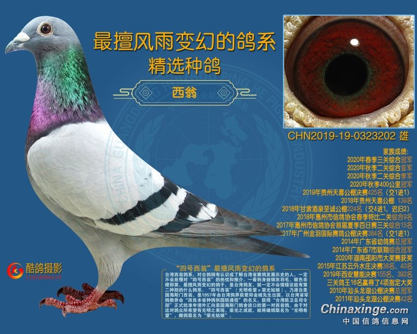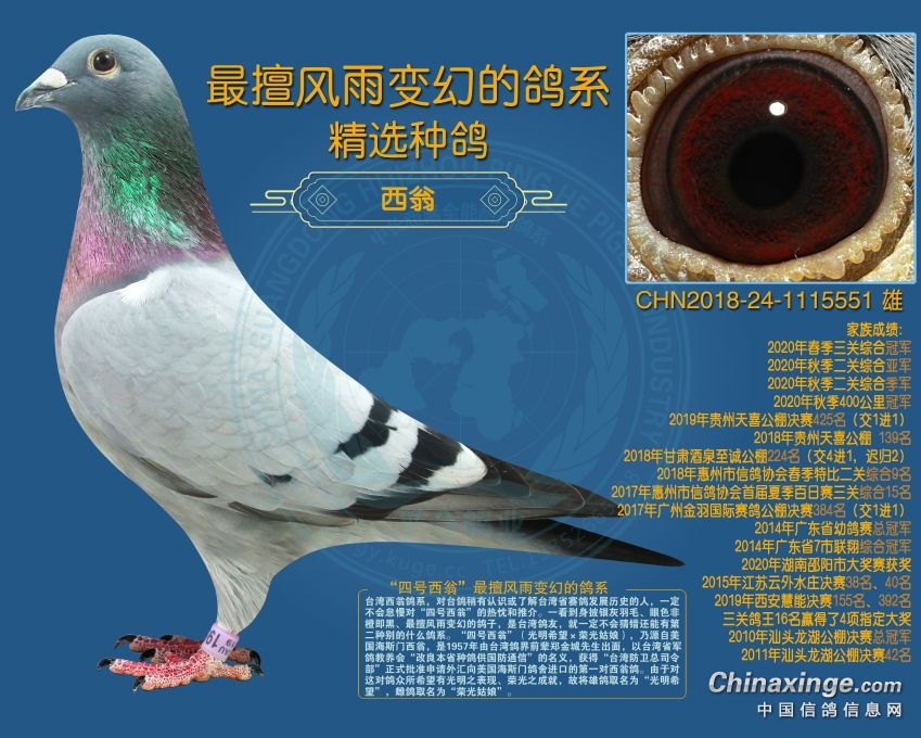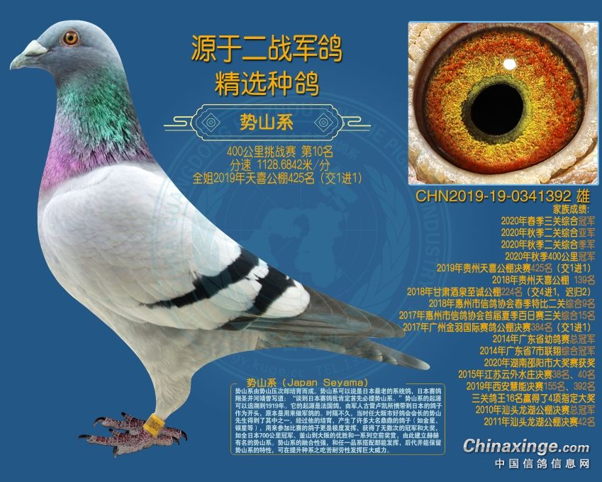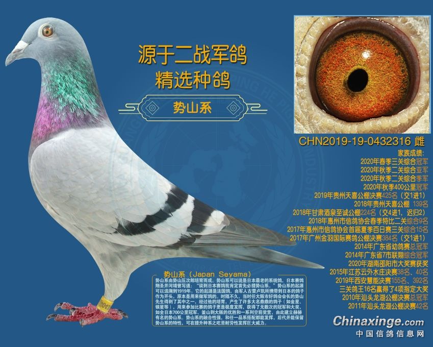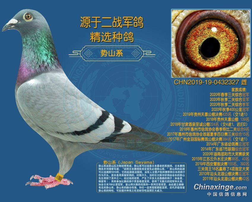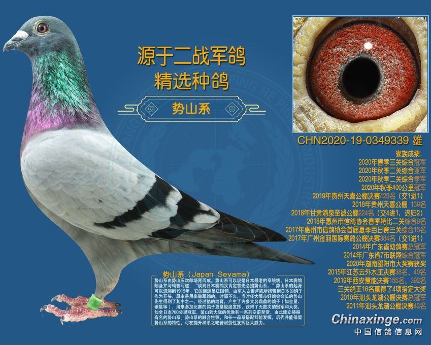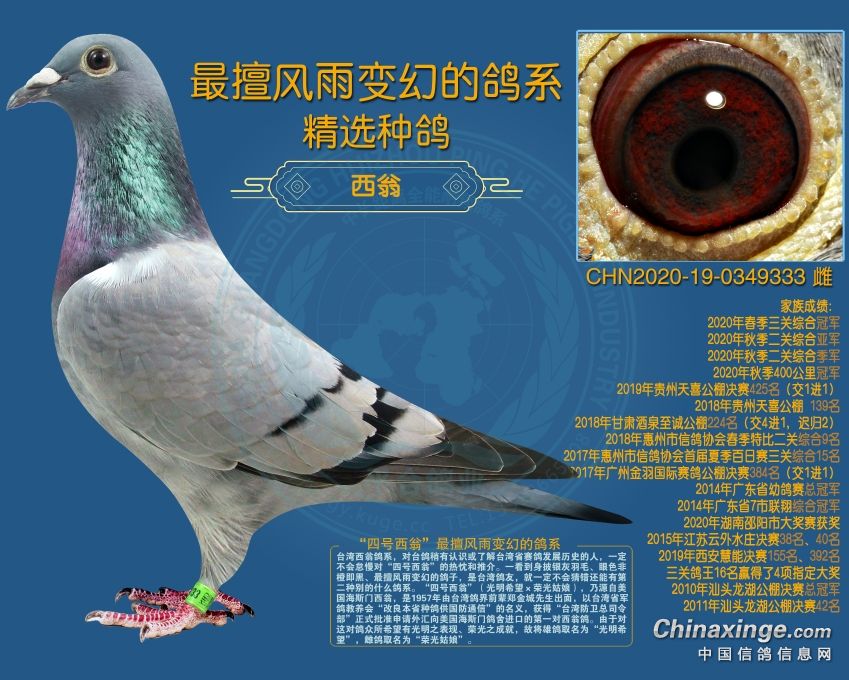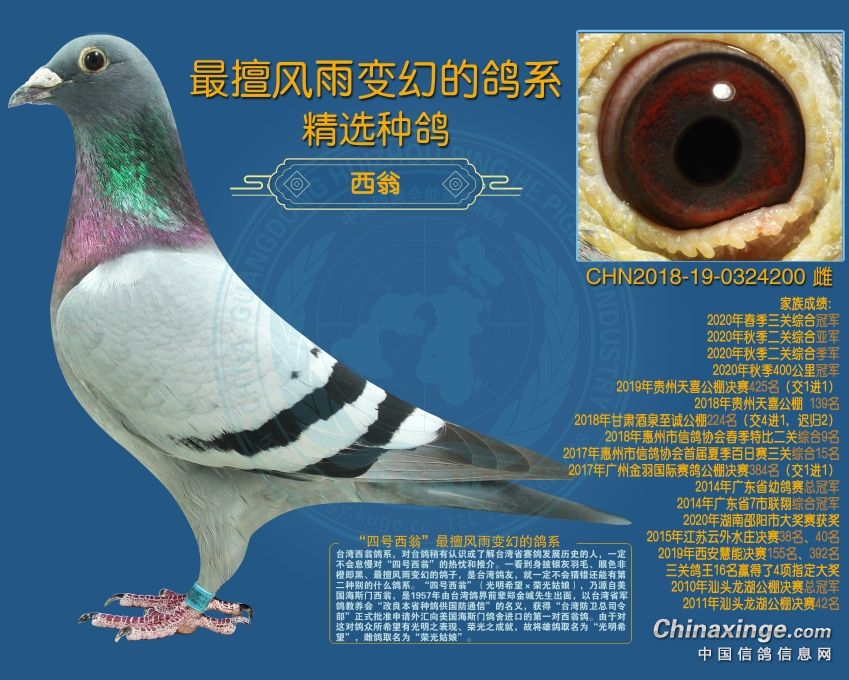 最实战的品系,最高级的个体。今天晚上8:00分享给有缘人,大家敬请期待!主要血统有:杨阿腾,势山,四号黑目西翁‘国血土匪号,原环盖比、詹森老白眼,定位国内中长距离的恶劣天气多关赛。鸽系耐粗,入赏率高,适合山地、丘陵地区的赛事。 作育成绩: 2020年春季三关综合冠军 2020年秋季2关综合亚军 2020年秋季2关综合季军 2020年秋季400公里 冠军 2019年贵州天喜公棚决赛425名(交1进1) 2018年贵州天喜公棚决赛加站赛139名 2018年甘肃酒泉至诚公棚224名(交4进1,迟归2) 2018年惠州市信鸽协会春季特比2关综合9名 2017年惠州市信鸽协会首届夏季百日赛三关综合15名 2017年广州金羽国际赛鸽公棚决赛384名(交1进1) 2014年广东省幼鸽赛总冠军 2014年广东省7市联翔综合冠军 平辈成绩: 2020年湖南邵阳市大奖赛综合8名 2015年江苏云外水庄决赛38名、40名 2019年西安慧能决赛155名、392名,三关鸽王16名,赢得了4项指定大奖 2010年汕头龙湖公棚决赛总冠军 2011年汕头龙湖公棚决赛42名