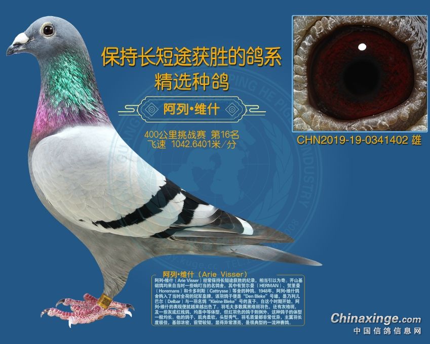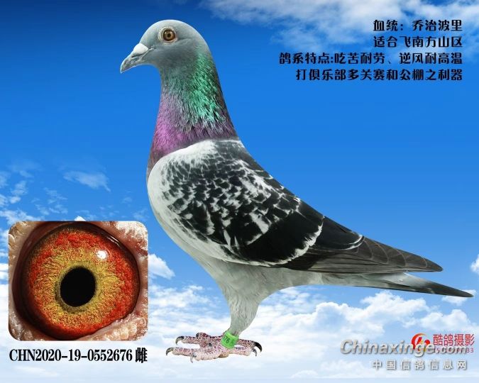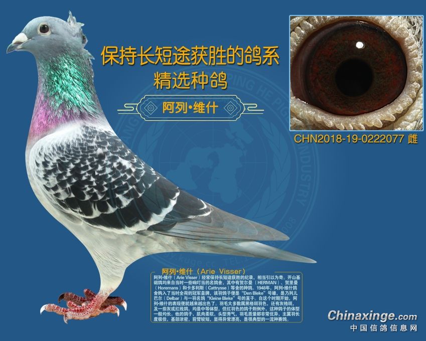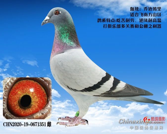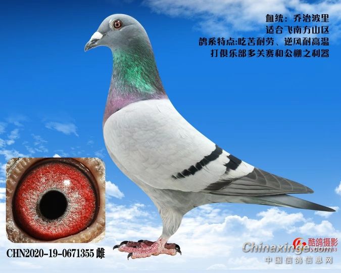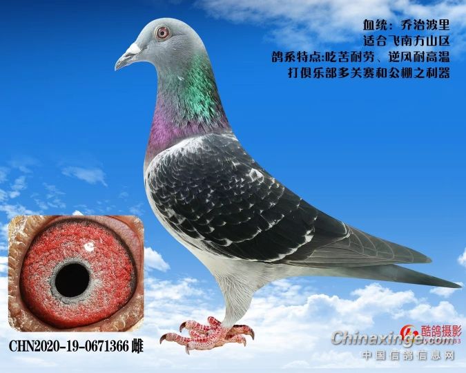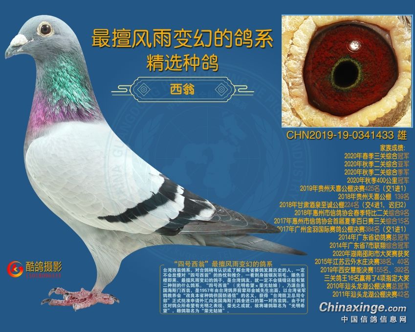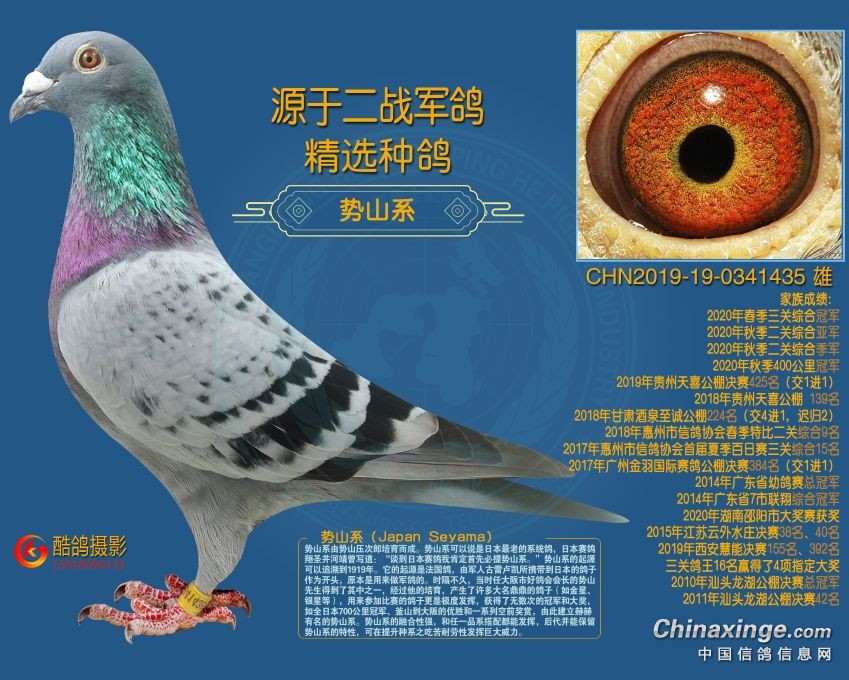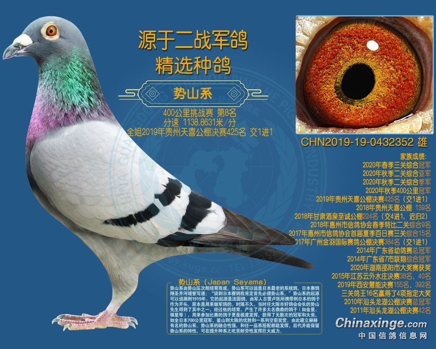 最实战的品系,最高级的个体。今天晚上8:00分享给有缘人,大家敬请期待!主要血统有:杨阿腾,势山,四号黑目西翁‘国血土匪号,原环盖比、詹森老白眼,定位国内中长距离的恶劣天气多关赛。鸽系耐粗,入赏率高,适合山地、丘陵地区的赛事。 作育成绩: 2020年春季三关综合冠军 2020年秋季2关综合亚军 2020年秋季2关综合季军 2020年秋季400公里 冠军 2019年贵州天喜公棚决赛425名(交1进1) 2018年贵州天喜公棚决赛加站赛139名 2018年甘肃酒泉至诚公棚224名(交4进1,迟归2) 2018年惠州市信鸽协会春季特比2关综合9名 2017年惠州市信鸽协会首届夏季百日赛三关综合15名 2017年广州金羽国际赛鸽公棚决赛384名(交1进1) 2014年广东省幼鸽赛总冠军 2014年广东省7市联翔综合冠军 平辈成绩: 2020年湖南邵阳市大奖赛综合8名 2015年江苏云外水庄决赛38名、40名 2019年西安慧能决赛155名、392名,三关鸽王16名,赢得了4项指定大奖 2010年汕头龙湖公棚决赛总冠军 2011年汕头龙湖公棚决赛42名