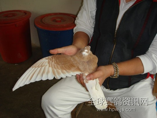 在北京演讲时很多人看了,这独特的持鸽术都以为是点穴,其实就是将中指在鸽翅膀内关节一押,翅膀就会很快的伸展开来。(如图二)是将鸽翅膀放开后展出的手法,(图一)是由上往下照的,无法看清底下的手法!在展开翅膀时,可以测出鸽子的关节柔软度!一般没比赛过的鸽子,内关节都会比较紧!经过训放比赛后,内关节一定会比较松!用这个方法:很容易测知飞没飞过比赛,就很容易感觉出来了!用这个方法:在台湾查出十多羽,国外的套用别人比赛资料的假记录鸽,有些环号只差一位数。如果不会就个手法,就不会对鸽子起任何疑心,再去收集其他佐证了!当单手持鸽子时,它不会不舒服而两脚还是保持朝后,这就是鸽子的平衡感。