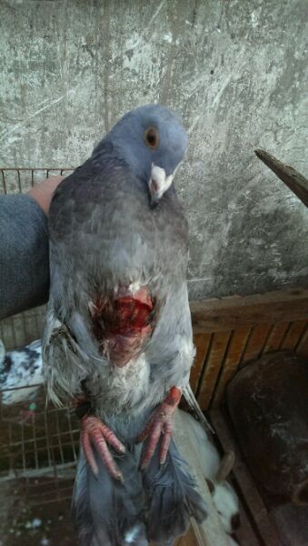 体验了一把“不死必归”——两个月的幼鸽,前天家飞时丢的,昨天没回来,今天早上我正在刷牙,它噗通一声直接落在鸽棚上。我过去一看,不知道被哪个天杀的家伙给夹成这样,两条腿全废了,流着血飞回来的,不知道它是怎么逃脱的,两只脚都不能动,是怎么飞起来……哎。惨不忍睹!