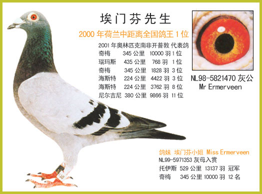 本人已经养信鸽40年,引进考夫曼蓝色精灵 黄金女郎 哎玛文血统.04年引进南非世界冠亚军直子,米卫梦幻组合直女,马克罗森斯,詹森019等。经本人培育改良取得冠军 亚军 季军 前百名多次!~现以打公棚为主!~欢迎各位朋友前来做客交流 本舍长期出售詹森 卡洛斯米老鼠 考夫曼 凡龙 米卫 胡本 电话 18202421718<……