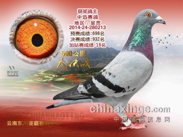 2011年开始参加公棚赛。2011年玉溪和平鸽赛鸽中心决赛88名,参赛交费2羽。2012年玉溪和平鸽赛鸽中心决赛272名,参赛交费5羽。2013年玉溪和平鸽赛鸽中心决赛60名,两天总归巢250羽,参赛交费8羽。2014年玉溪和平鸽赛鸽中心决赛51名,两天总归巢110羽,决赛上笼3羽。本舍参赛交费9羽。2014年东川豪庭赛鸽中心,500公里加站赛19名,当天归巢49羽,上笼1027羽。本舍参……