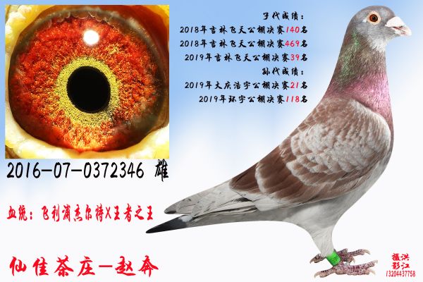 本人:仙佳茶庄☞赵老板 从小喜欢鸽子,2017正式参加比赛,18年大天龙公棚300公里90名,420公里170名,双关路虎汽车第二 ,赢得指定1万多!环宇公棚决赛258名。18年飞天公棚决赛140名,469名同窝双双进奖!2019年进奖10多羽!忠盛VIP进奖2羽264-321名,大团体八名。飞天公棚进奖4羽,小团体冠军,600公里加站83名。环宇决赛进奖4羽,小团体五名,加站46名。大庆浩宇决赛21名,251名!唐山钰博公棚大团体亚军,赢得汽车一台。2020年继续努力!