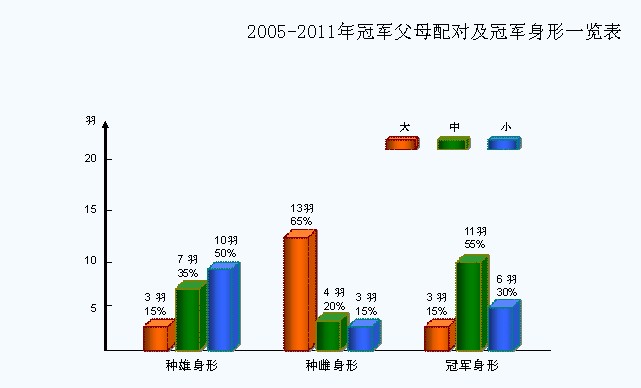1`作出冠军父亲的身形分别为:干瘦小体形种雄11羽,比例为55%;中体形种雄6羽,30%;大体形种雄3羽,仅占15%
