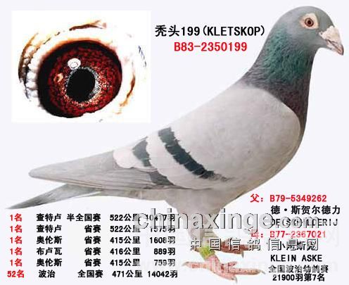 秃头号199的子孙后代,在世界鸽界发挥得淋漓尽致,产生的大名鸽举不胜数。如:脚指头号B83-2350008 又名008;马西斯号 B86-2118256;教父B85-1359331;063号B81-2396063;速度号B89-2593842等等。这些世界级大名鸽的后代在世 界各地极具发挥,形成了一系赛绩卓著的鸽系。例如:2000年波治冠军含电脑血统50%;2001年维尔松半全国赛冠军含电脑血统50%;布利福全国冠军 含电脑血统50%;蒙托帮全国赛冠军含电脑血统25%;里蒙治全国冠军含血50%;恩格菜姆佛兰德省赛冠军含血50%;凡瑞特2001年全国幼鸽鸽王三位 (获8次冠军)含电脑血统50%。在我国2001年蚌埠昊方公棚百万元大奖赛冠军,为电脑戈马力﹒佛布鲁根先生鸽系血统。