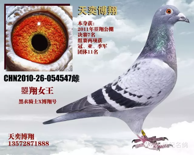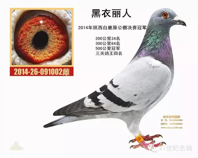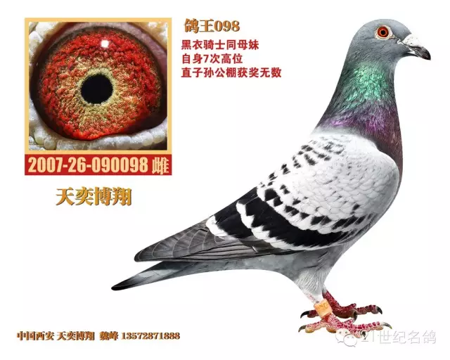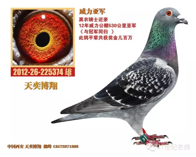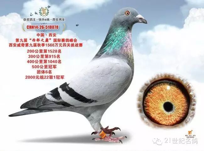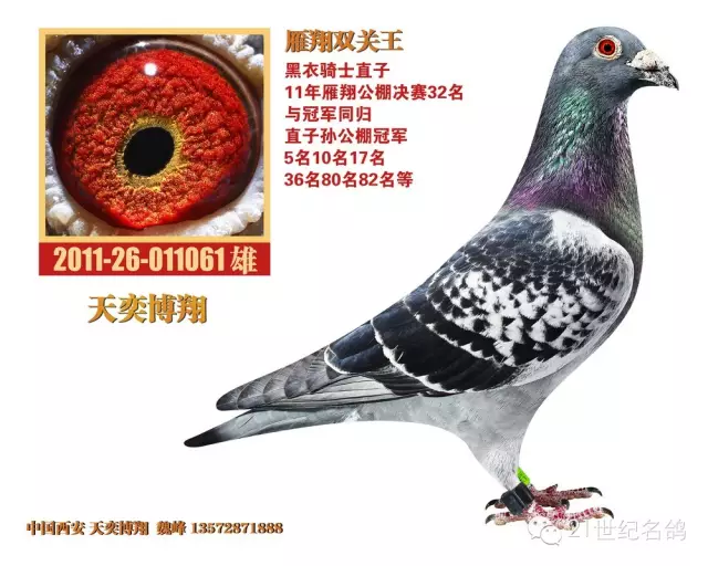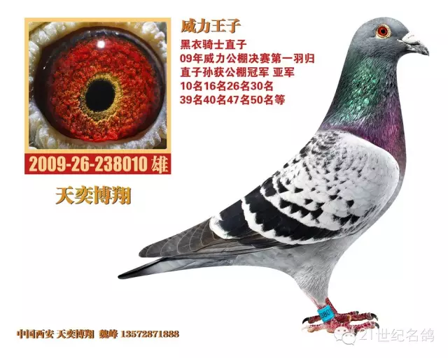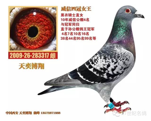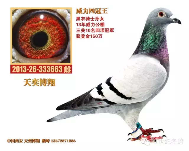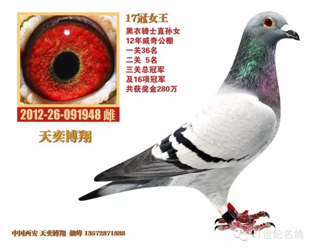 代表直孙女:2012年陕西威奇国际赛鸽公棚< 荣获:决赛总冠军、金手指冠军、鸽王冠军、此鸽为本鸽业共荣获奖金280余万元,三辆路虎车 环号:2012-26-091948、共计荣获十七冠军头衔 >