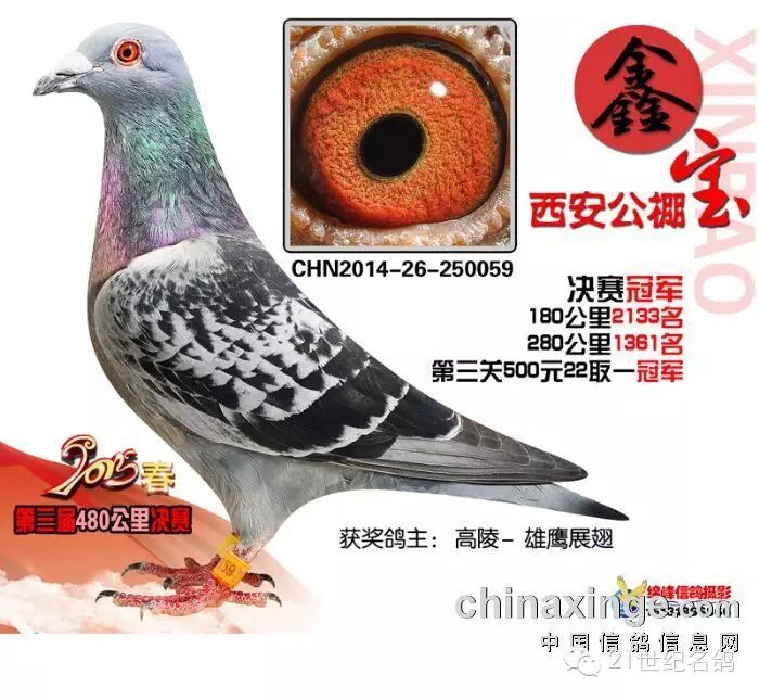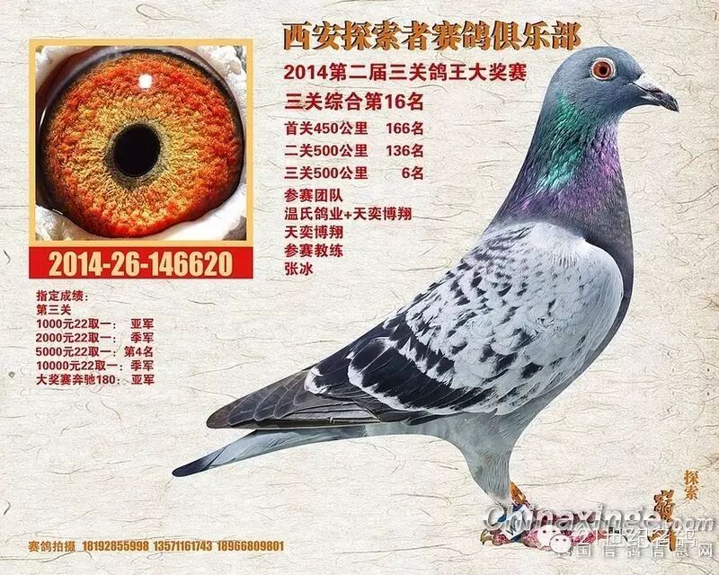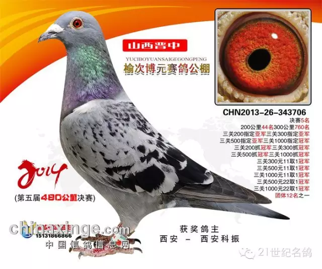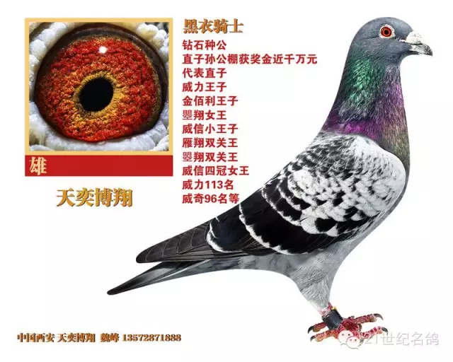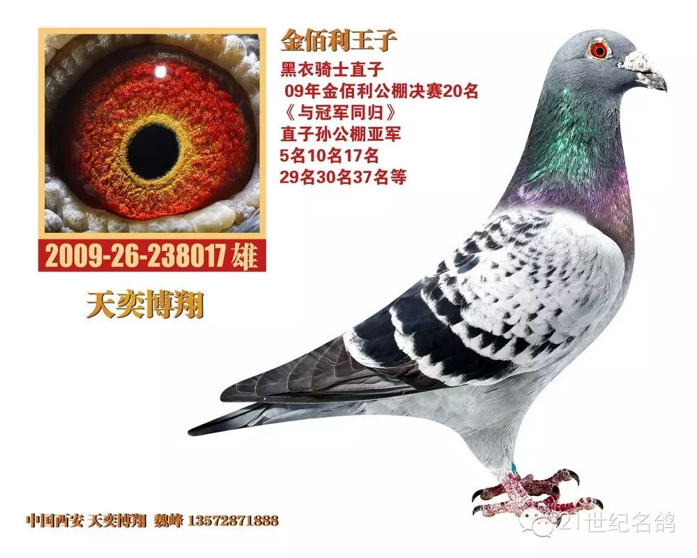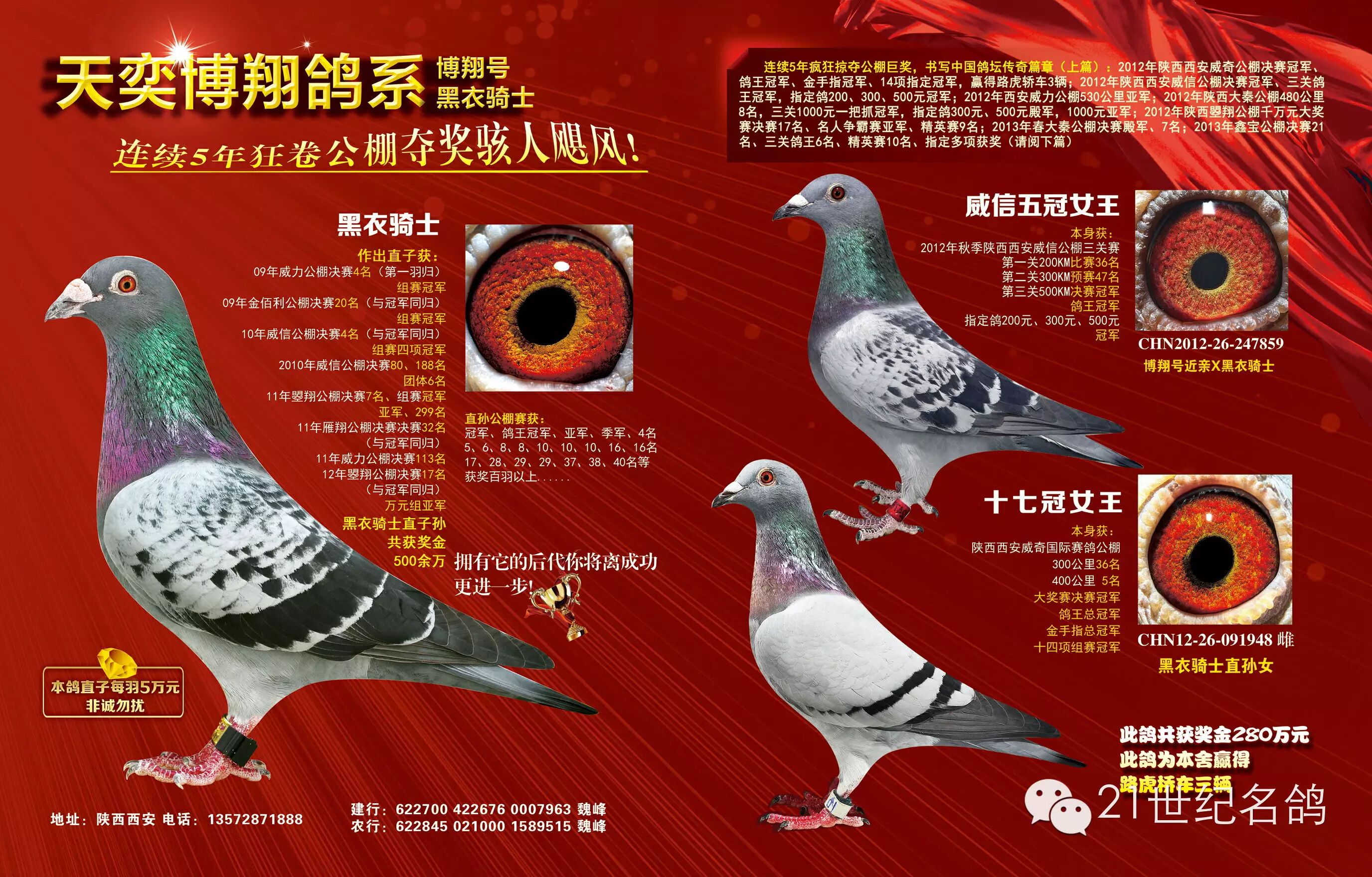 代表直孙女:2012年陕西威奇国际赛鸽公棚< 荣获:决赛总冠军、金手指冠军、鸽王冠军、此鸽为本鸽业共荣获奖金280余万元,三辆路虎车 环号:2012-26-091948、共计荣获十七冠军头衔 >