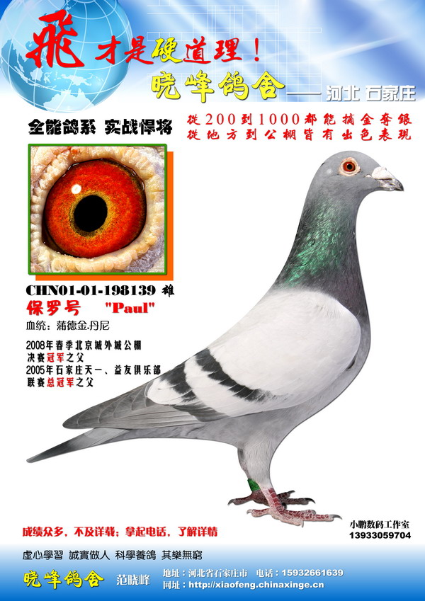 石家庄晓峰鸽舍于2000年建棚,几年来在市鸽会、俱乐部以及公棚比赛中取得了较好的成绩.从200-1000公里共取得前十名近百次,其中冠、亚、季军40余次.06年秋获得金石公棚团体第三名,金霸公棚小团体第四名. 主要品系:波西瓦、 詹森 、詹吉 、山普森等.最新赛绩:2009年春河北点将台……