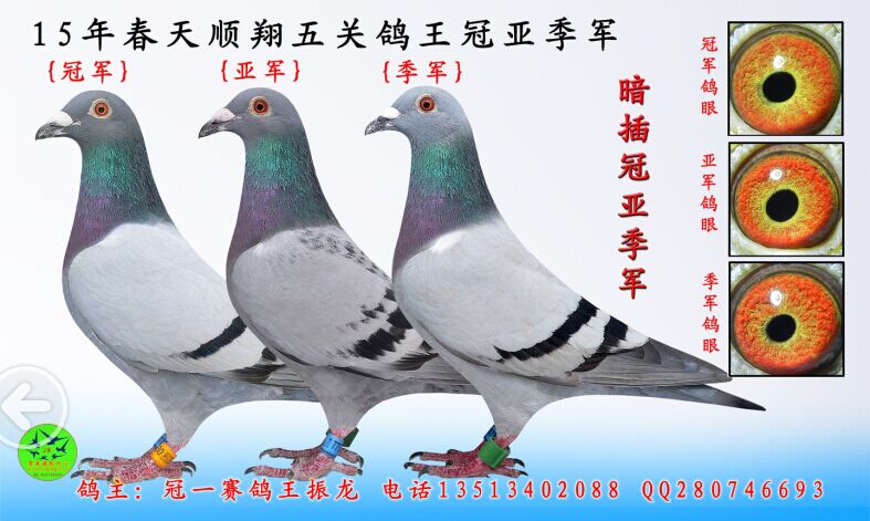 冠一赛鸽建立于2009年,本舍超级种雄 超级战将号 多次配过多羽雌鸽屡出冠军以及前十名。 子代 孙代 曾孙代 代代冠军..... 2012年第一场特比环比赛安新金源赛鸽俱乐部决赛总冠军 特比环冠军 金手指冠军 指定鸽冠军 一次拿下五项冠军。 第二场……