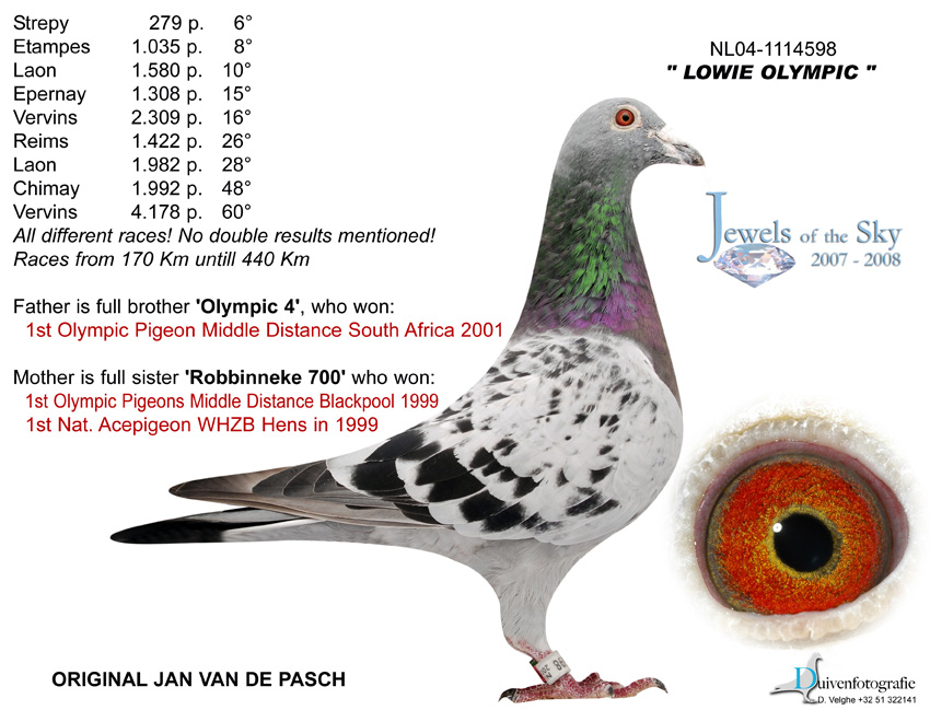 小路易NL04-1114598原名“奥林匹克 路易”荷蘭WHZB之王凡德帕許(J. Van De Pasch)作翔血統: 詹森(狮王路易B96-538外孙)本鸽幼鸽时期,4次优等记录,一岁鸽时期10次优等记录,共计25次高位入赏。本身赛绩:地名 &……
