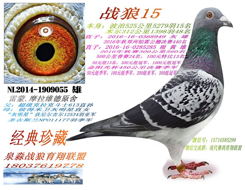 2017年春安徽福禄缘公棚500公里决赛87名。 协会 300公里29名、30名、93名等。 500公里14名、24名、38名、46名、47名、61名、109名、123名、124名、191名等。 100元特比4名、6名、15名、39名。 双关鸽王冠军、4名、5名。 金阳光400公里11名、22名、34名、45名、47名、55名、57名、68名等。 2017年秋武汉黄浦公棚决赛241名 2017年秋山东舜峰公棚决赛495名(此鸽交费后丢失,决赛前三天归,直上500) 2018年春安徽金凤凰公棚决赛149名、243名、341名、400名、420名大团体5名、小团体10名。(缴费10羽决赛上笼8羽归6羽进5羽)