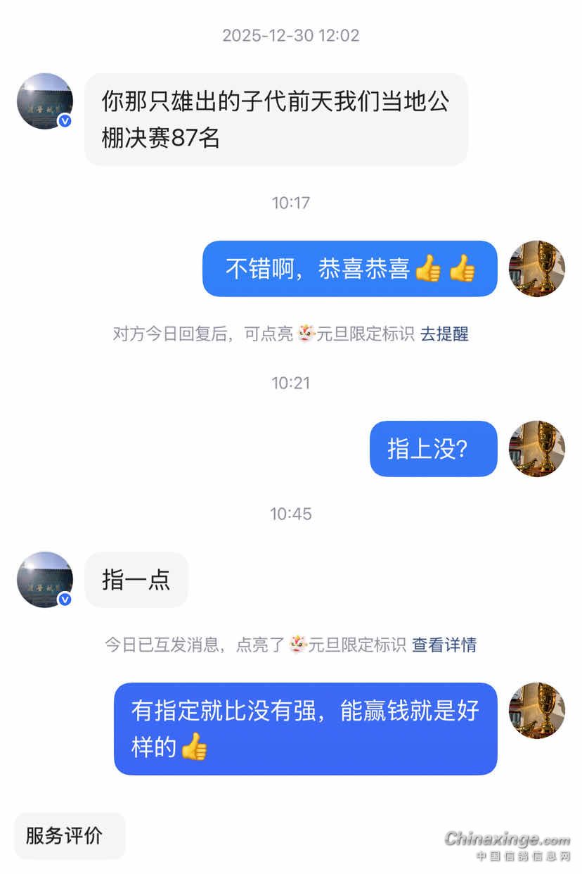过节了昨天打开快手,发现有个之前拍我公棚奖鸽的鸽友传来喜报,说拍我的开尔奖鸽的后代在当地的公棚取得决赛87名的好成绩,听到这个消息很开心,跟自己的鸽子飞了好成绩一样的开心。