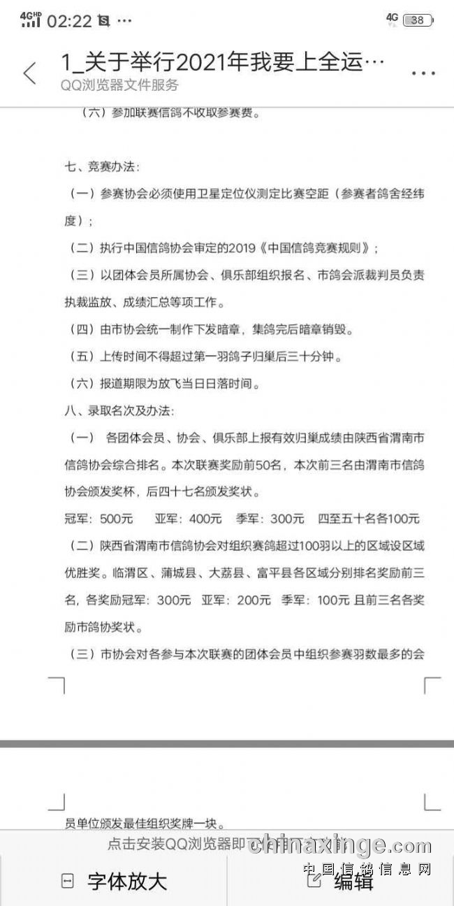 比赛定于2021年6月3日集鸽,比赛分为三个集鸽点,各自协会俱乐部用自己的报道系统,最终成绩由渭南市信鸽协会综合各各协会俱乐部成绩,再排列出联赛成绩,本次比赛不收取参赛费,联赛奖励五十名,各协会俱乐部集鸽上一百羽,由渭南市信鸽协会再奖励各协会俱乐部前三名,奖杯,奖金,奖状均由渭南市信鸽协会发放。