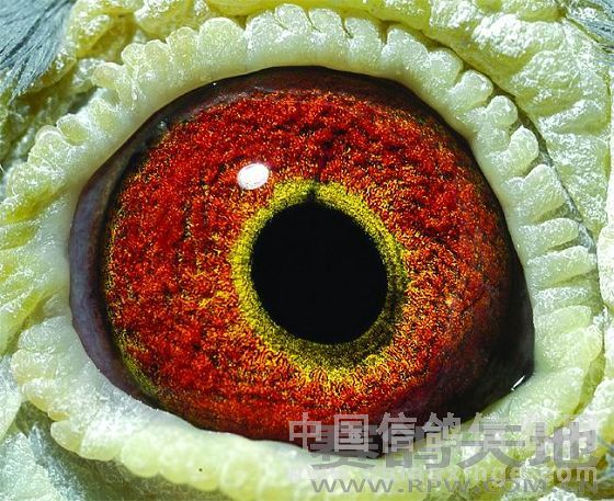 信鸽眼睛:瞳孔黑,收放不拘光线,内圈宽糙厚呈锯齿型,砂满清淅颗粒大,红里透黑,目光锐利,反应敏捷,适于超远程比赛。(体型中等偏大) 我国上海历届信鸽超远程比赛获奖鸽子,多见此种砂型。