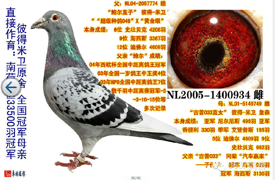 祖父:99MSMITH51 战神 2001年赛鸽文摘鸽王冠军, 2001年东部联合会中距离成鸽鸽王冠军