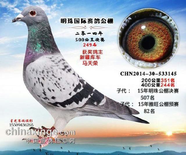 14年首次参加甘肃明珠国际公棚,参赛3羽,决赛获得249名。