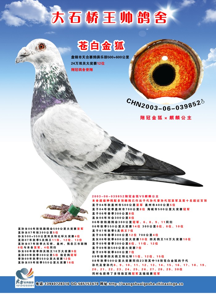 本舍自身参赛成绩06年春季1000公里当日归.冠军.[[仅放一羽]].四关综合.亚军.辽宁省千公里连翔.总季军.06年秋季铁路鸽会300公里大奖赛[[冠军]].6.8.9.11名指定鸽冠军.300公里5.8名.06年秋季铁路鸽会500公里大奖赛.亚军.市会550公里大奖赛.4.13.14名.指定鸽冠军.600公里.冠军.指定鸽.冠军.11名.2007年秋季300公里5.6.8.10.12.15名.550公里大奖赛10名.500+600公里双关大奖赛4.8.10.13.15.23.25.28名550公里8名.盖州市会550公里连翔.亚军4.6名.[盖州.大石桥.熊岳].08年春季300公里.亚军.5.8.12.15名2008年春季500公里季军.7名08年春季700公里4.5.12名. 2008年秋季320公里25名.500公里8.9.10.11.12.13.14.15.16.17.18.19.20.21.22.23.24.25.26.27.28.29.30名.550公里2.15.30.32.33.35.36.37.38名.600公里10.17.18.19.20.36.40.50.51.52.53.54名 四关大 奖赛9.10.19.21.29.32.35.42.45名. 2009年春季320公里6.11.12.24.25.28.35.37名.500公里9.31.34.40.44.45名700公里9.19名 2009年秋季320公里5.指定鸽冠军.550公里12.13.14.16.39名.500公里7.9.30.31.44.46名.600公里7.24.25.34.48名 四关大奖赛11.12.15.22.26.39.49.51名 祝全国鸽友身体健康赛季更佳同时祝愿中华信鸽信息网越办越红火QQ565153479