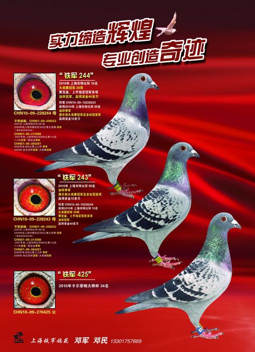 邓军.邓民俩兄弟养鸽30余年,经验丰富,成绩优秀。在上海历届比赛中取得优异成绩,近年来更是势如破竹,一发不可收拾。冠.亚.季军及高位名次无数。支援其它鸽友也取得很好成绩。
