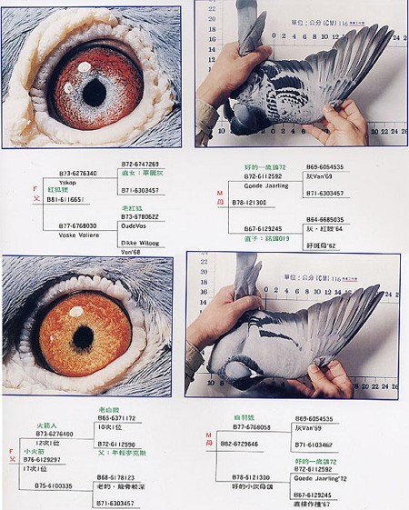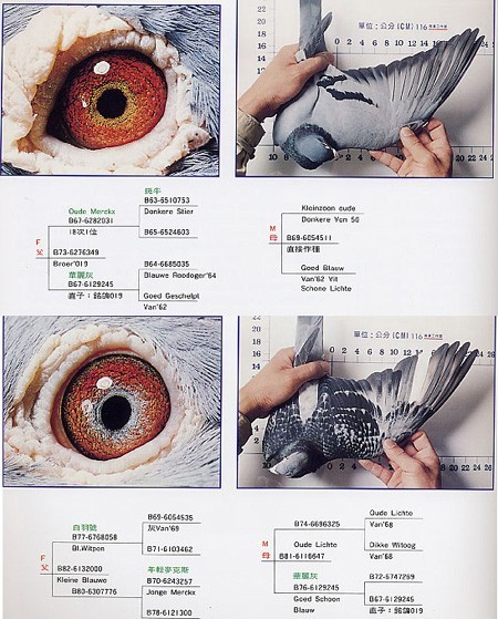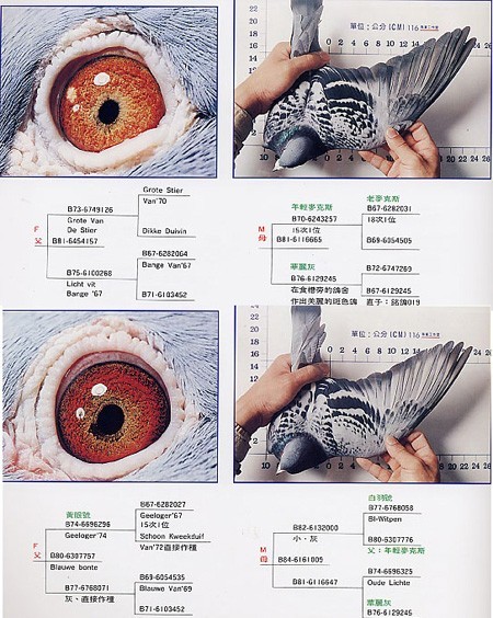 (5)用华丽灰孙代与019孙代作出的雄鸽配老麦克斯直孙与华丽灰直孙作出的雌,这还是一个双重回血配的成功例子。(6)用019子代雄配年轻麦克斯直孙雄与019的平辈华丽灰直子雌的子代。其子代的品质不容多想,是任何人都梦寐以求的。