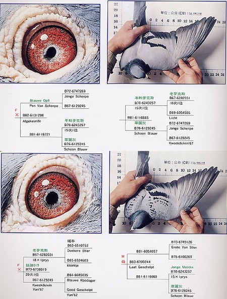 12、虽然詹森育种原理中介绍,詹森父子非常注重鸽子尾巴上面的羽毛是左面的还是右面的,并采用相异配,这样才能作出平衡性更好的鸽子。但这八对种鸽却都不是这样的配法,且只有一半符合他们的育种原理。詹森父子不卖配对、育种、饲养方法的做法大家都是知道的,所以,他们主动公开的那些育种原理,鉴鸽、饲养方法到底有几分是真的呢?我想除了詹森父子外,没有任何一个人敢肯定。但他们作出优秀赛鸽的事实和八大配对图片倒是真实的,所以,我们该相信谁呢?