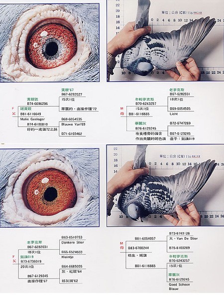 10、在所有的16只种鸽中,有14只鸽子的眼砂均不是理想中的美观,但其却有独到之处。眼砂美观的鸽子并不一定就是只好鸽子的道理他们是非常明白的,所以,他们配对的第一目的是让赛鸽出成绩,在此基础上再让它们变得更好看。但詹森父子并没有公布或发表他们作育种鸽的图片和血统书,其用意之深,大家不得而知。