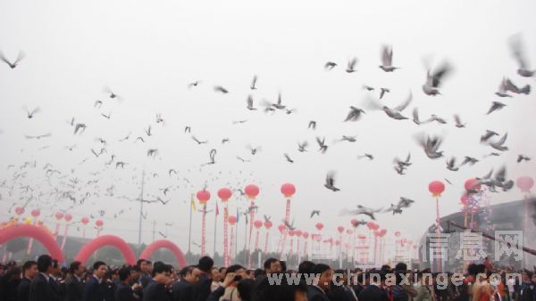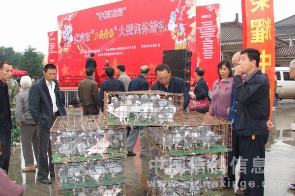 为欢庆祖国60华诞,有宝鸡市市委组织,政协,人大主办。陕西西凤酒协办的建国60周年,60对新人集体婚礼在炎帝园隆重举行。我火车头信鸽协会受邀请,为大会饲放了999只彩鸽 。成功的饲放过程受到组织方的好评。