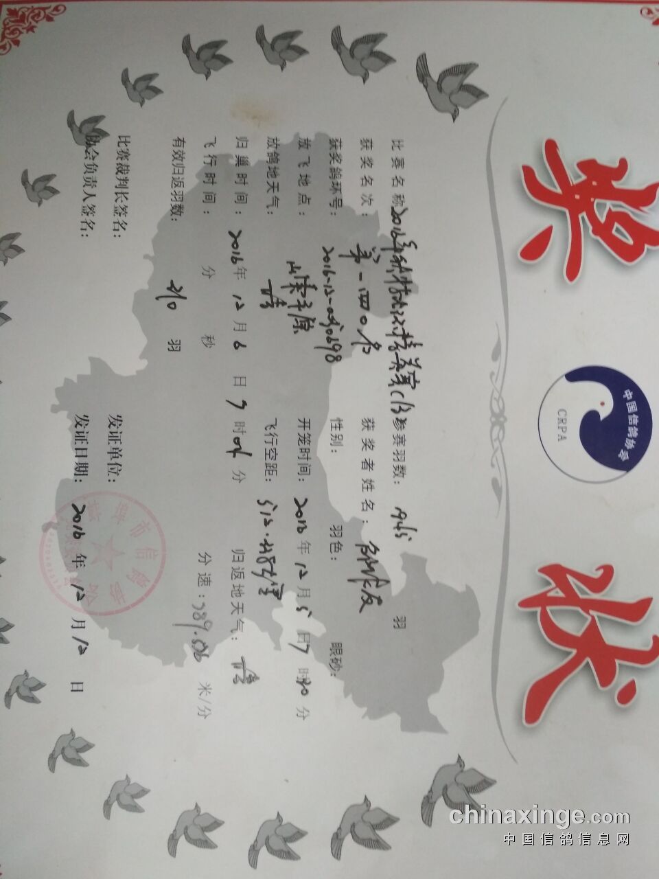 奖状拿回来才知道原来400和500公里都是万羽以上