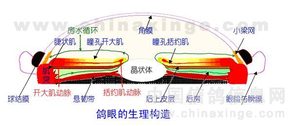| 血液循环:血液循环的目的为供应鸽眼运动所需的氧和能量,将血液代谢产生的酸性物质带走。鸽眼中的瞳孔开大肌、括约肌都由睫状肌突进行血液供应,虹膜中有,虹膜大动脉环处于虹膜的外围——外封砂位置;虹膜血管,位于开大肌表面的血管层——面砂位置;虹膜小动脉环位于括约肌——眼志内部。其血液循环路线(参照鸽眼生理构造图)为:睫状肌突——虹膜大动脉环——虹膜血管——虹膜小动脉环;静脉系统的血液循环——毛细血管网——睫状前静脉、涡静脉——海绵窦与眼下静脉。 |