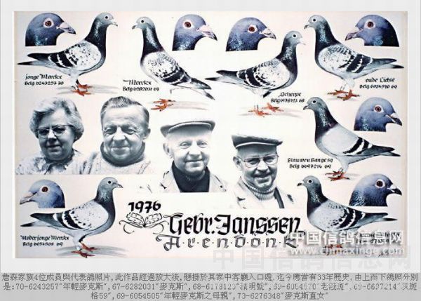 除了给他的父亲亨利提供了上述2羽优秀的种鸽之外,冯斯•詹森还给盖斯特•霍夫肯提供了鸽子。霍夫肯用它们和凡•克洛克的鸽子杂交形成了一支世界级的队伍。“Eenoger”B56-6353631是一羽传奇的赛鸽和种鸽。 它的孙子“Dreibander”B64-6151612是另一羽优秀的赛鸽和种鸽,这两羽鸽子帮助卡尔•慕利门和杨•格兰多拉斯取得了伟大的成功。上述两羽鸽子是属于盖斯特•霍夫肯的众多顶级鸽子中的一员,它们都是冯斯•詹森的鸽子的后代。佛兰斯•詹森是一位优秀的赛鸽家,他所使翔的鸽子是来自于其他兄弟的鸽子杂交的产物。他提供鸽子给著名的路易斯•凡龙,正是这些鸽子使后者踏上了成功之路。杰夫•詹森对赛鸽运动接触不多,而维克尽管和大家住在一起却对此完全不感兴趣。阿德里安是育种者,他对此具有敏锐的眼光。他是一个沉默寡言的人,每当他讲话时人们都停止讲话并认真听他说。查理一方面负责育种另一方面他在使鸽子保持最佳状态方面是一个能手。他是兄弟中最具有竞争性的人,在阿德里安于1981年去世后查理接替了他的工作。兄弟中最小的路易斯负责管理帐册,赛鸽使得詹森兄弟名扬四海,因此他还负责商业经营。他因记忆力出色而闻名,无论是对鸽友还是对鸽子。一些人说在鸽子方面的投入他不及阿德里安和查理,但是我记得多年前读到过艾迪•夏拉肯所写的《詹森兄弟传奇》,在57页有一张路易斯手握“老黄眼”的照片,这张照片是在“老黄眼”被卖到日本前拍的。他眼中流露出悲哀和自豪立刻呈现出他是一位真正的赛鸽家。