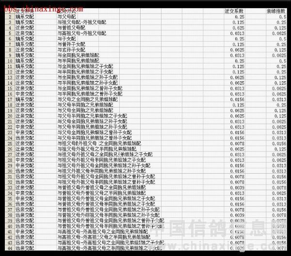近交系数-亲缘指数对应关系表: