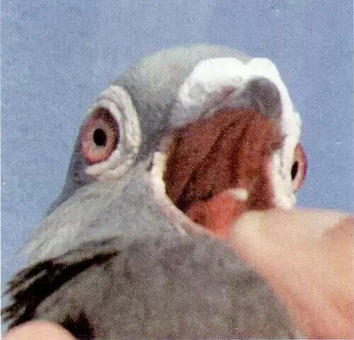 4.最后也是最重要的一点,尤其是对长距的鸽子:硬颚上的裂缝(医学上称为颚裂)必须是张开的。如果颚裂是封闭的,即使是一只好鸽子,也会在飞翔的时候给鸽子造成负担,尤其是长距离或是恶劣天气的比赛。一只鸽子在飞翔时每秒呼吸5次,即使呼吸系统有一点小问题,也会影响鸽子的呼吸,造成缺氧,导致鸽子疲倦。最典型的结果就是头部肿大,一般不太好治。更得注意的是,口腔内的皮肤变得苍白,没有血色,这表明鸽子的病情已经很严重了。蛔虫也能导致鸽子的口腔皮肤以及眼睛的颜色没有血色;肿瘤也能导致同样的后果。目前只能通过解剖尸体才能做出正确的诊断。