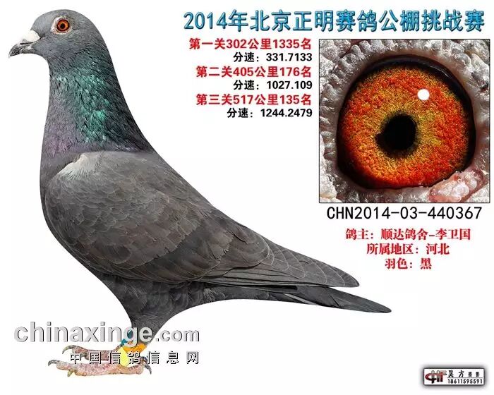 一只11年03-180583灰白条,林波尔系雄未放路直接做种,12年送北京“京亿公棚”决赛获204名,13年送“诼洲三义公棚”决赛获65名,14年送“北京正明公棚”决赛获135名,另一只送“涿州海逸公棚”530公里加强赛获56名,其后代连续3年送4只打公棚,全部进奖。而03-180583灰白条平辈鸽,在07至10年连读四年在公棚均有进奖。