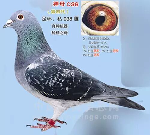 神母038的奇妙之处在于:不管杂交还是近交,配国血还是外血,都能轻易作出前10名入赏鸽。更重要的是,这些子代不论雌雄均是黄金种鸽。