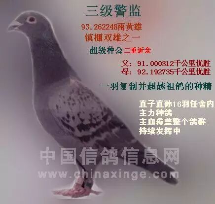三级警监首窝作出95.039733获济南市鸽会706公里13名,后又作出96.000466获俱乐部息县526公里亚军,幼鸽冠军。